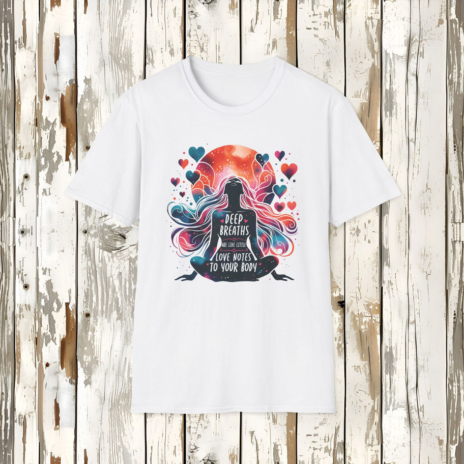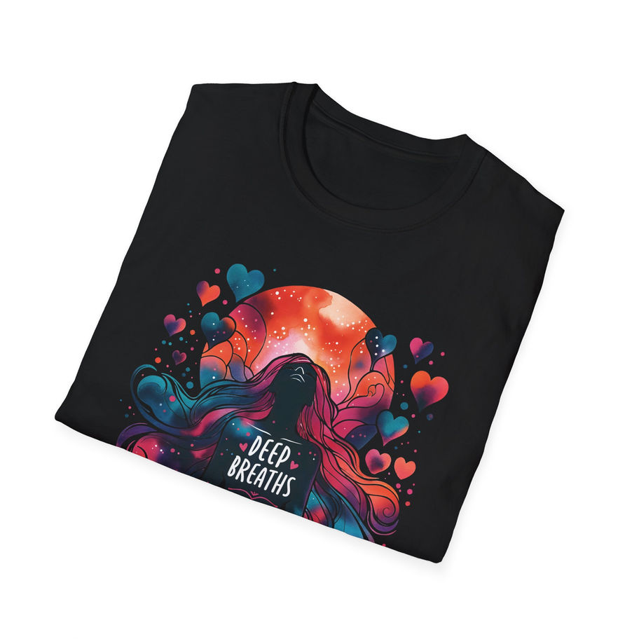 This beautifully artistic T-shirt is a gentle reminder to slow down, breathe deeply, and appreciate the love your body deserves. Featuring a meditating silhouette with flowing cosmic hair, heart accents, and a glowing sun backdrop, this design captures the power of mindfulness, inner peace, and self-care.