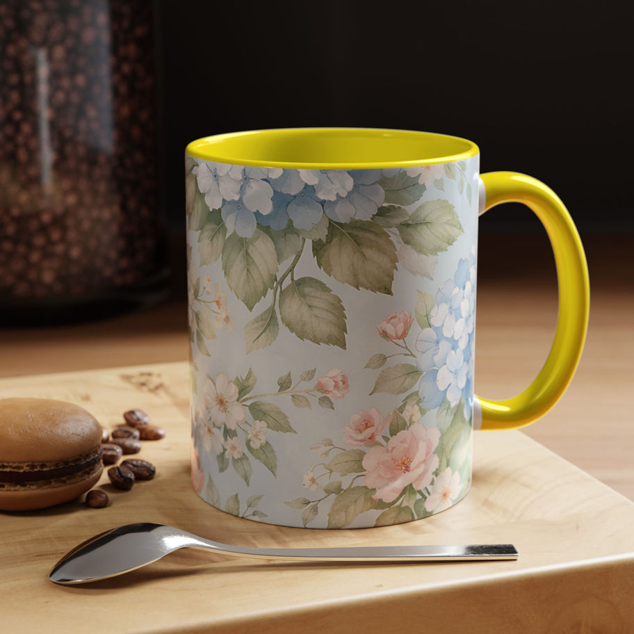 Hydrangea & Rose Garden Mug (11oz) – Soft Blue Floral Coffee Cup