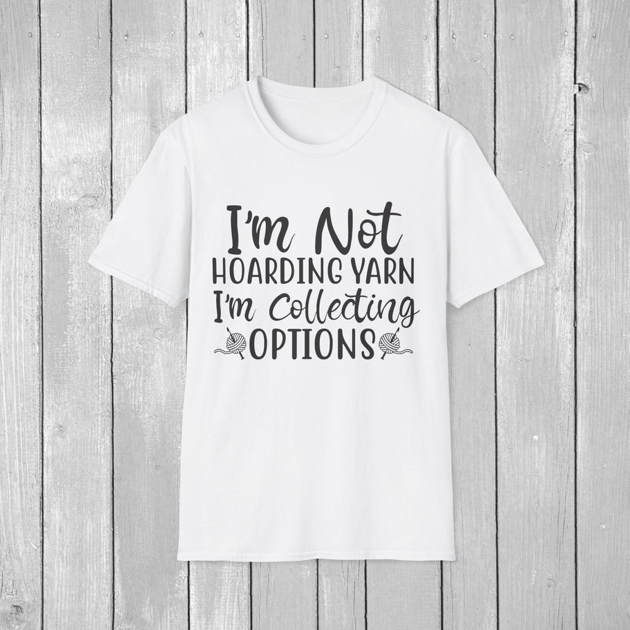 Celebrate your love for yarn with a humorous twist! Our "I'm Not Hoarding Yarn, I'm Collecting Options" T-shirt is perfect for knitters, crocheters, and yarn enthusiasts who know the joy of having a stash for every creative mood. The playful design combines bold black lettering and adorable yarn graphics, making this tee a must-have for crafting fans.