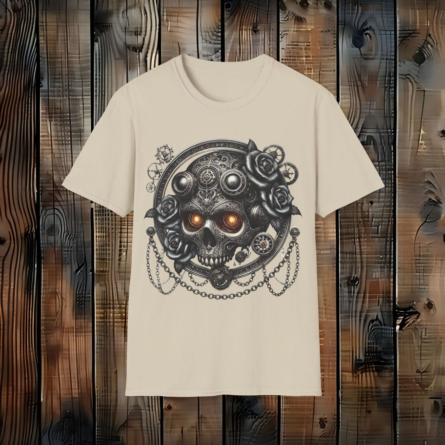 Step into the world of dark industrial elegance with this breathtaking steampunk skull design. Intricately detailed gears, chains, and metallic engravings form a gothic skull crowned with roses, while fiery glowing eyes burn with mechanical power. A perfect blend of beauty and menace, this shirt is made for those who embrace bold alternative fashion, gothic aesthetics, and steampunk culture. Whether at a concert, festival, or casual outing, this striking design makes an unforgettable statement.