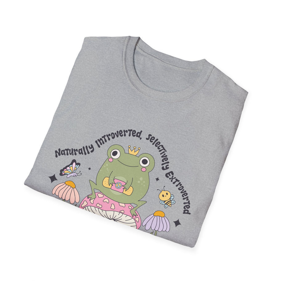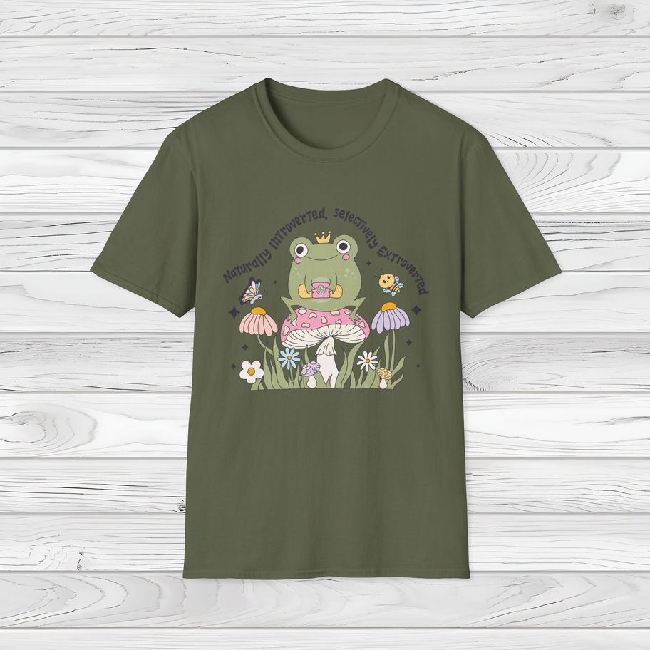 For those who love their quiet time but shine in the right company, this "Naturally Introverted, Selectively Extroverted" T-shirt is the perfect way to express your unique personality. Featuring an adorable crowned frog sipping tea while sitting on a toadstool, surrounded by whimsical flowers, mushrooms, and tiny woodland creatures, this design brings cozy cottagecore vibes with a playful twist.