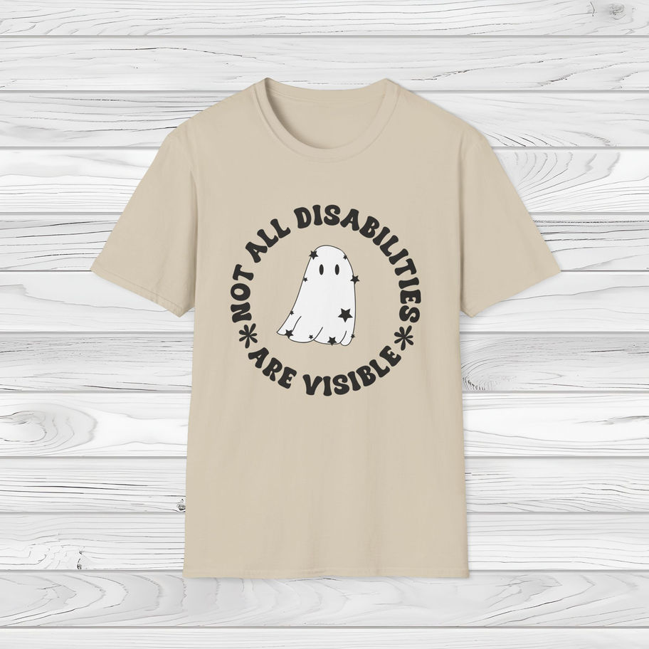 Highlight the importance of understanding and empathy with the "Not All Disabilities Are Visible" T-shirt. Featuring a minimalist black-and-white design with a charming ghost illustration surrounded by the impactful message, this shirt is perfect for raising awareness about invisible disabilities. Simple yet powerful, it’s a great way to spark conversations and promote inclusivity.