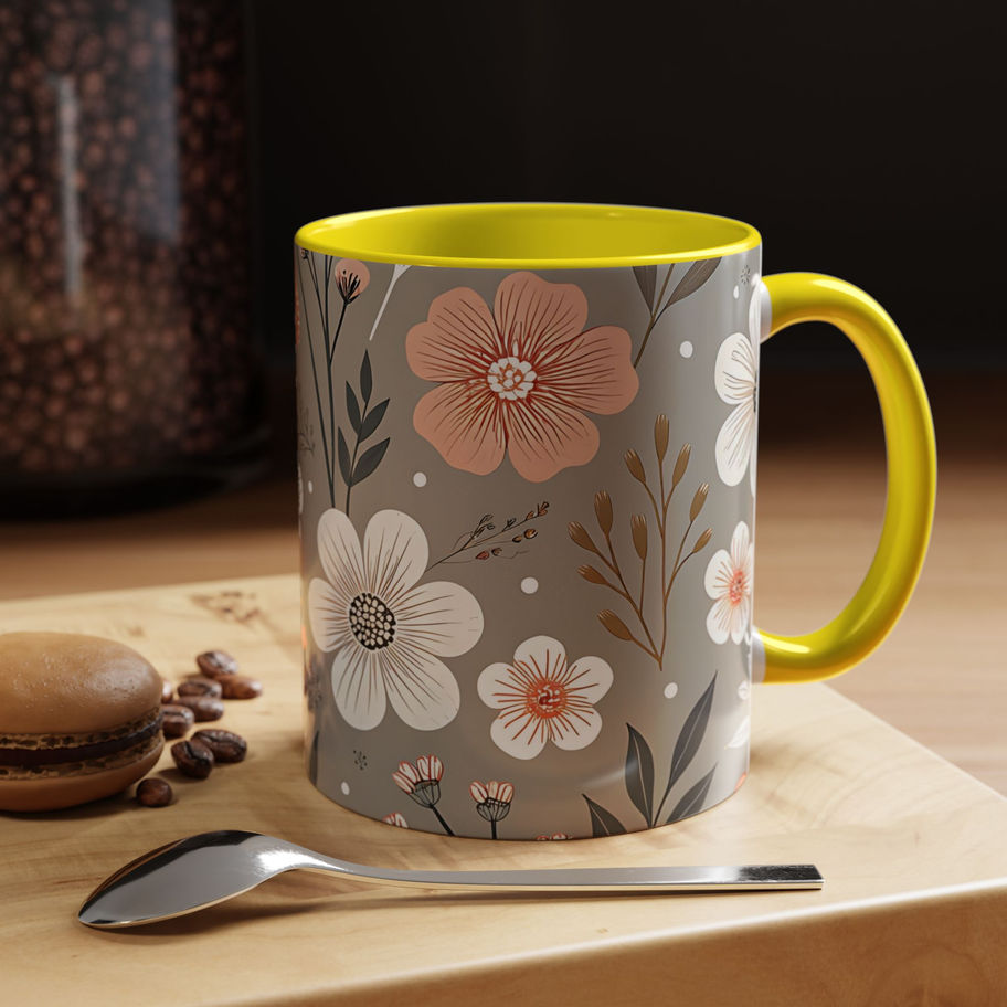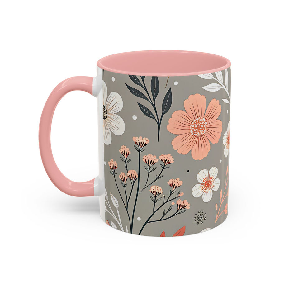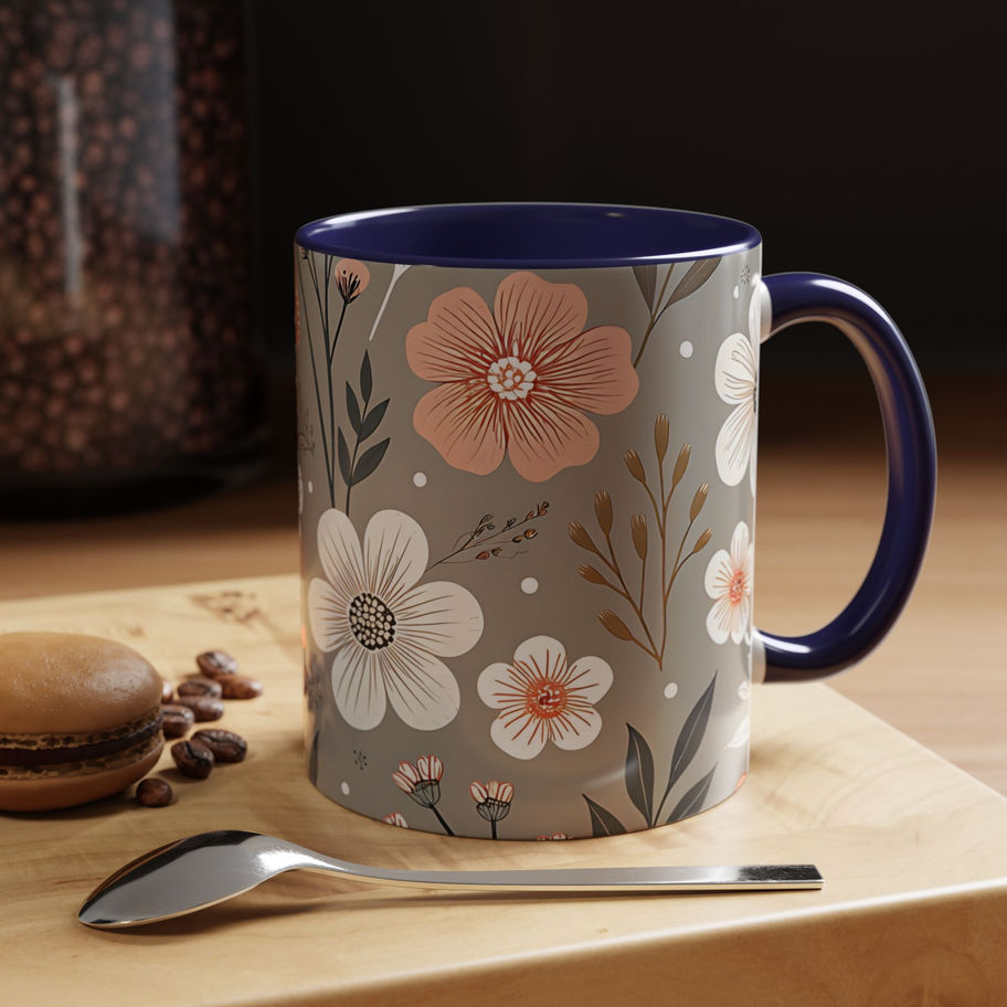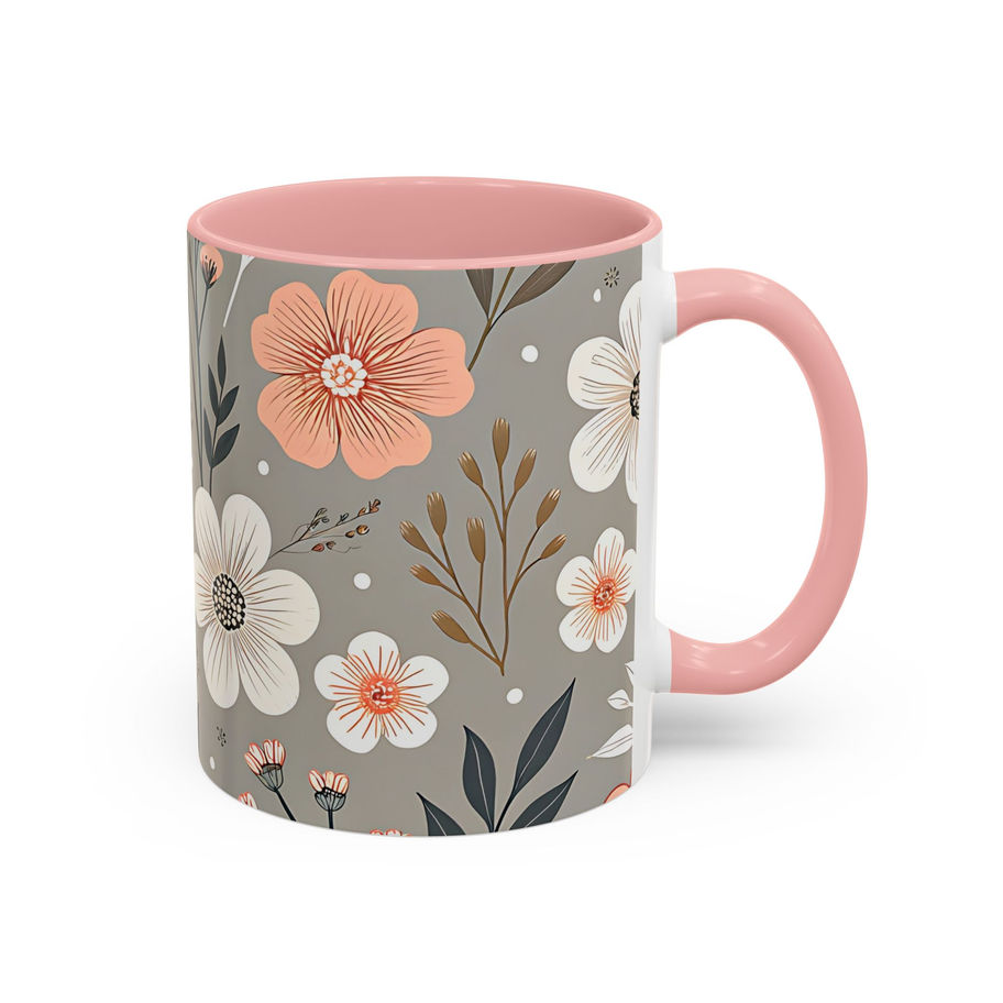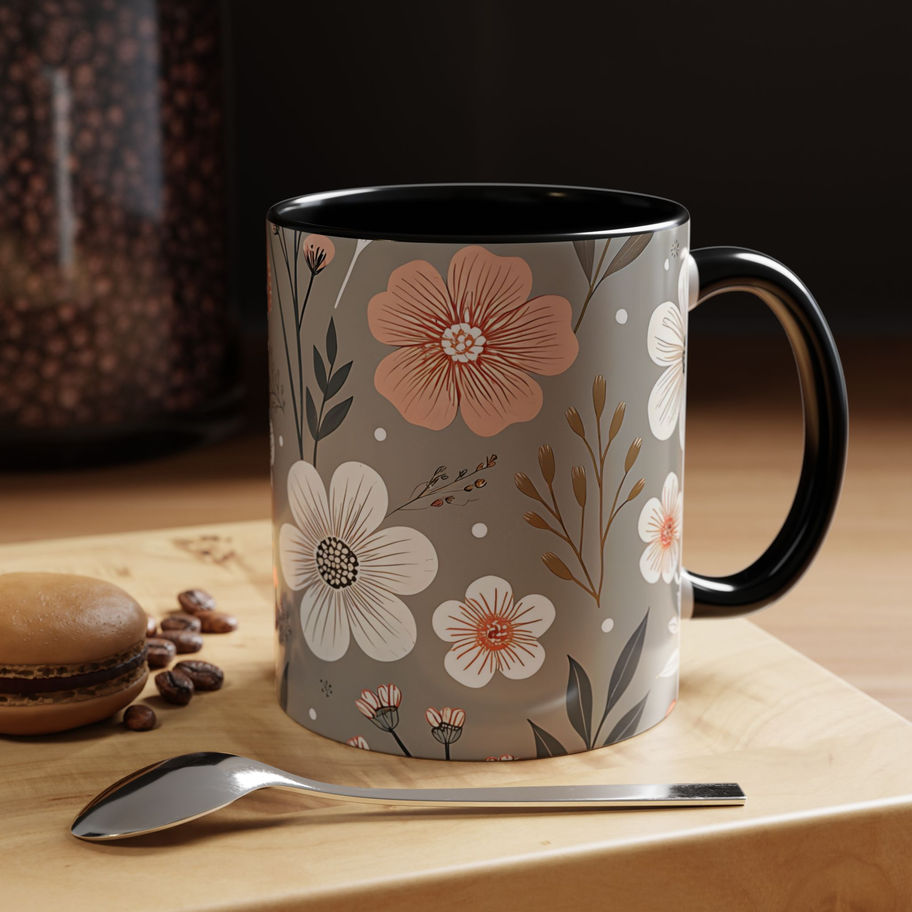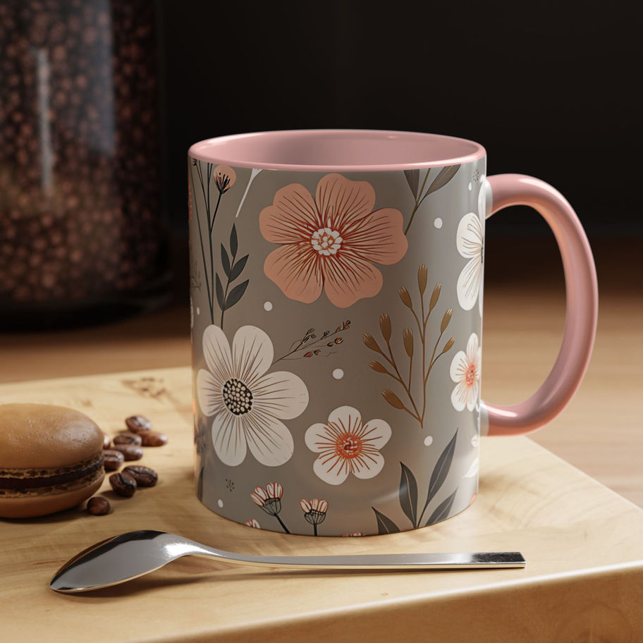 Soft Taupe Floral Mug (11oz) – Elegant Blush & Ivory Botanical Coffee Cup