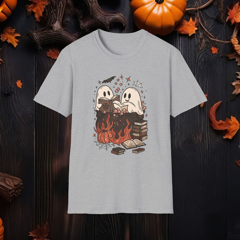 Get into the Halloween spirit with this adorable yet spooky Ghosts Cauldron tee! Featuring two playful ghosts brewing up magical mischief in a bubbling cauldron, surrounded by flames, books, pumpkins, bats, and cobwebs, this design blends creepy-cute vibes with a dash of humour. Perfect for anyone who loves Halloween, witchy aesthetics, or ghostly fun.