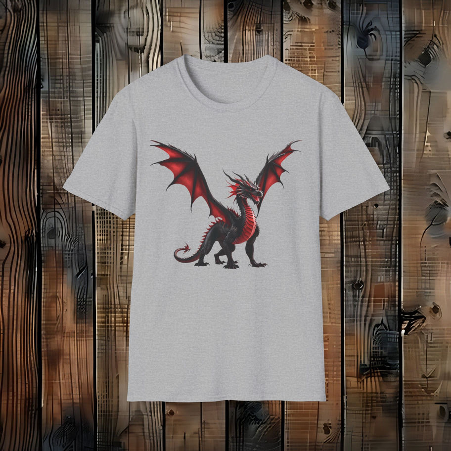 Ignite your wardrobe with the fiery presence of this epic dragon design. Featuring a powerful black and crimson dragon with wings spread wide, this artwork captures raw strength, fury, and mythical power. Perfect for fantasy lovers, gamers, and dragon enthusiasts, this t-shirt is a bold way to showcase your love for legendary creatures. Whether at a convention, gaming night, or casual outing, this design ensures you stand out with a fierce and unforgettable look.